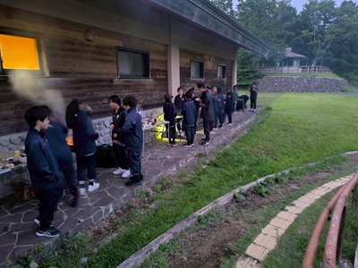 その後は天候の影響もあり、予定を変更して焼き板ペインティング体験、そして、夕食のバーベキューを行いました。自分たちで炭をおこし、クラスメートと楽しく食べる夕食は格別の味がしたようです。