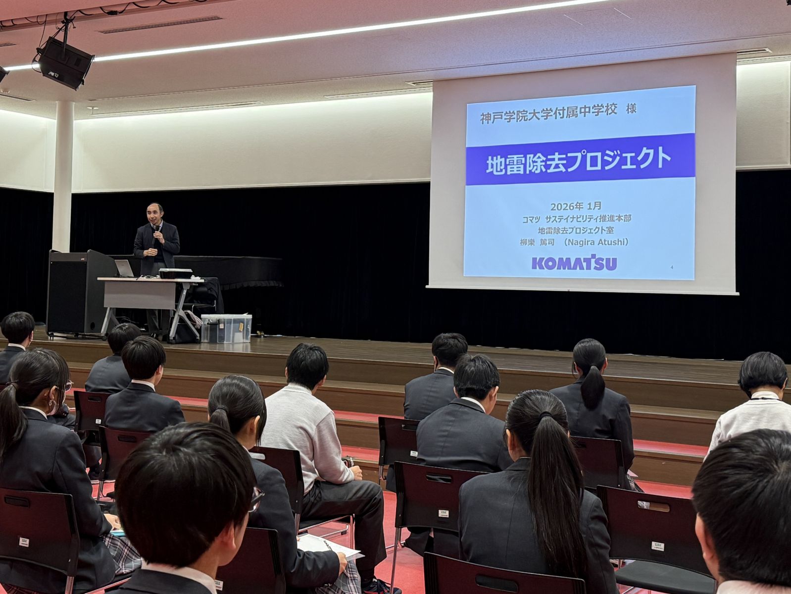 1月29日(木)中学2年生は、コマツの地雷除去プロジェクトの取り組みに関する講演会を実施しました。