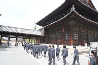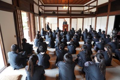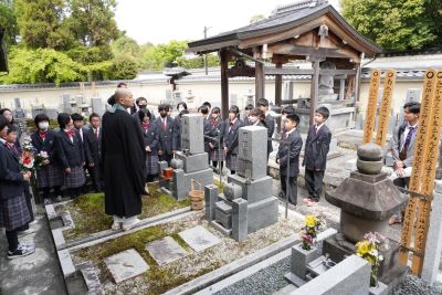 新入生宿泊研修初日。まずは本校の校祖・森わさ先生の墓参のため、京都の妙心寺に向かいました。霊雲院の伊藤厚元老師様から、本校の校祖、森わさ先生が大切にされていた禅の心や、本校創設にまつわるお話などをしていただきました。