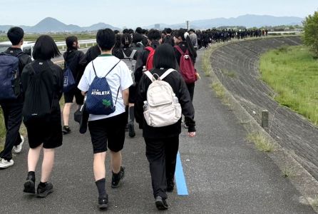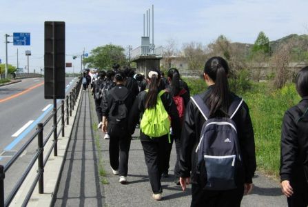 新入生宿泊研修2日目は、30kmウォーキングを実施しました。長命寺温泉天葉の湯(近江八幡市)から、琵琶湖岸(さざなみ街道)を通り、水生植物公園みずの森を経由して琵琶湖博物館(草津市)に至るコースを、生徒と教員で歩きました。休憩と昼食をはさみながら、9時頃から16時頃まで、約7時間の行程でした。生徒は、疲れた表情を見せながらも、互いに励まし、コミュニケーションを取りながら歩き切りました。